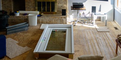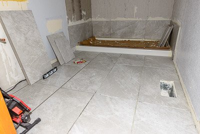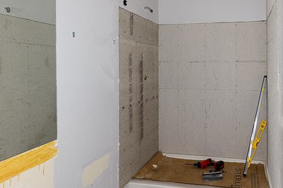 Setting the shower base and hanging cement board walls. Installing cement board underlayment.