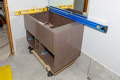 Drilling the holes in the cabinet for the water supply and the drain. Hanging the vanity securly to the wall.